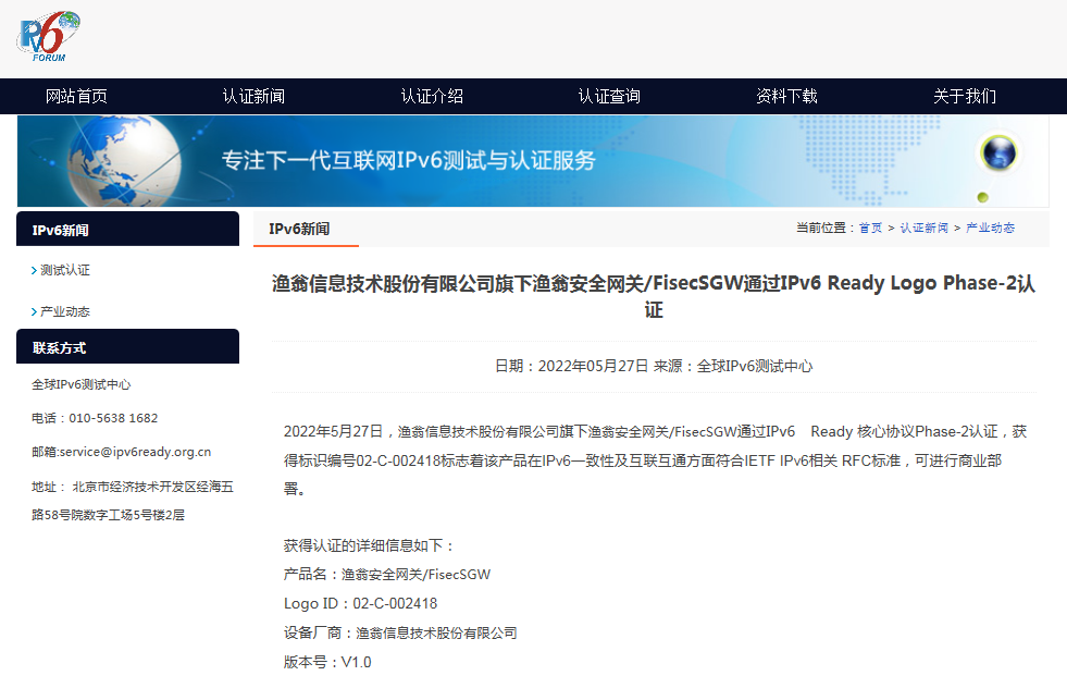 近期,公海555000官网安全网关 FisecSGW在下一代互联网国家工程中心-全球IPv6测试中心正式顺利获得IPv6 Ready核心协议Phase-2测试,并荣获由国际组织IPv6 Forum颁发的IPv6 Ready Logo Phase-2认证证书(Logo ID:02-C-002418)。