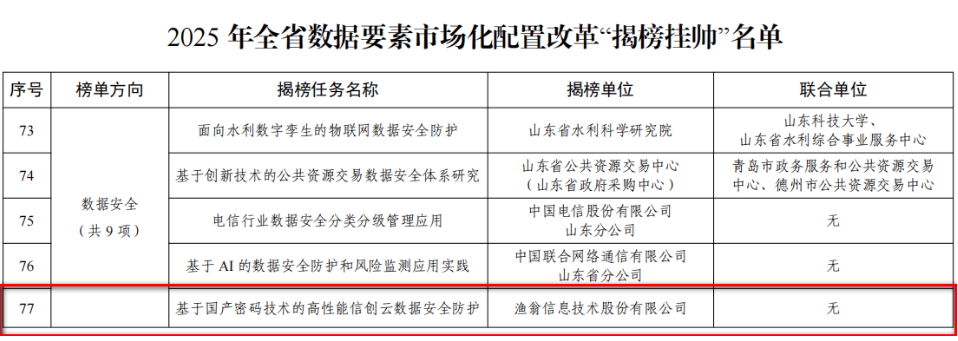 近期,山东省大数据局公布了《2025年全省数据要素市场化配置改革“揭榜挂帅”名单》。公海555000官网信息独立申报的“基于国产密码技术的高性能信创云数据安全防护”项目,凭借在数据安全与要素流通领域的技术创新与实践成果,从众多单位中脱颖而出,成功入选。公海555000官网信息成为揭榜单位中唯一的商密企业。