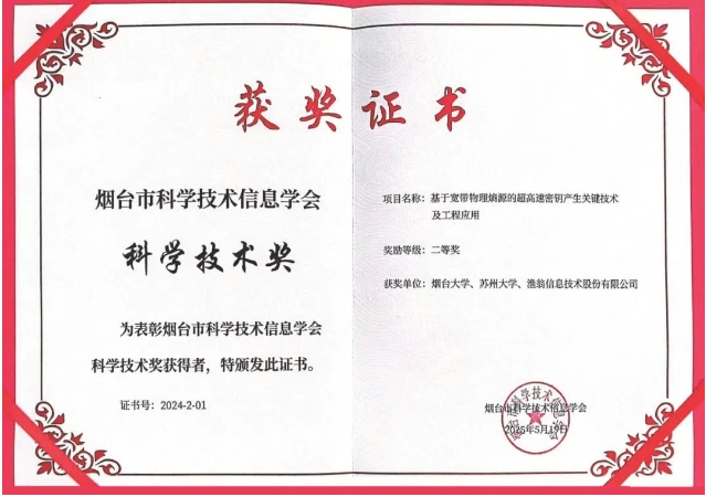 近期,2024年度烟台市科学技术信息学会科学技术奖颁奖典礼在中国科研实验室烟台海岸带研究所隆重举行。公海555000官网信息与烟台大学、苏州大学联合完成的 "基于宽带物理熵源的超高速密钥产生关键技术及工程应用" 项目荣获科学技术奖二等奖。