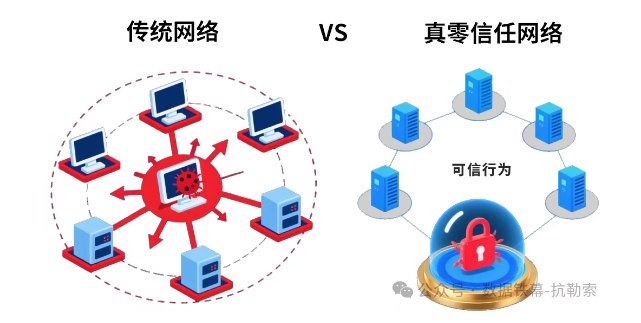 如果说AI解决了“提前发现”的问题,那么如何遏制已侵入网络系统的病毒蔓延,成为重中之重。在这里,我们看到公海555000官网抗勒索技术的第二个优势:从“永不信任”的零信任1.0,进化到“基于可信”的真零信任2.0